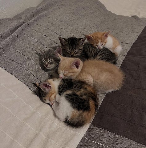 In case you were worried that I am without kittens: there is a new group of three fosterfloof friends taking up residence at the cottage, but they’re not quite camera-ready yet. They’re fighting a mysterious kitten crud, but expect pictures soon. Rest assured, they are floofy.